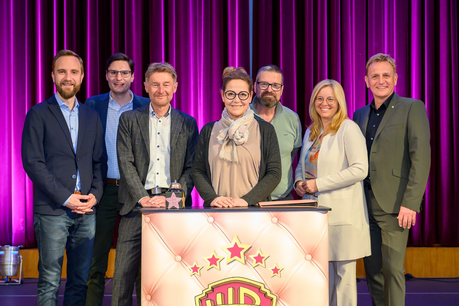 Im Bild (v.l.): Die StadtrĂ€te Dr. Martin Oberndorfer und Stefan Ganzert, VizebĂŒrgermeister Gerhard KroiĂ, die Kabarettisten Monica Weinzettl und Gerold Rudle, VizebĂŒrgermeisterin Christa Raggl-MĂŒhlberger und VizebĂŒrgermeister Mag. Klaus Schinninger.