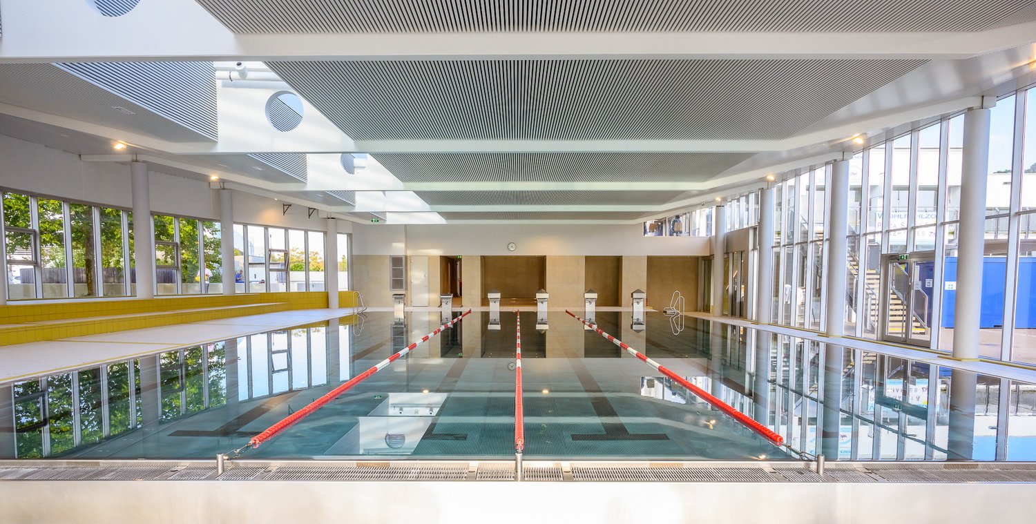 Ebenfalls runderneuert wurde die abgehängte Decke im Schwimmbadbereich. Die rund 1.900 Quadratmeter große Holz-/Gipskarton-Decke wurde durch eine Alupaneldecke mit erhöhten Schalldämmwerten ersetzt. Die beiden Sanitärbereiche im Erdgeschoß wurden vom Boden bis zur Decke saniert und runderneuert.