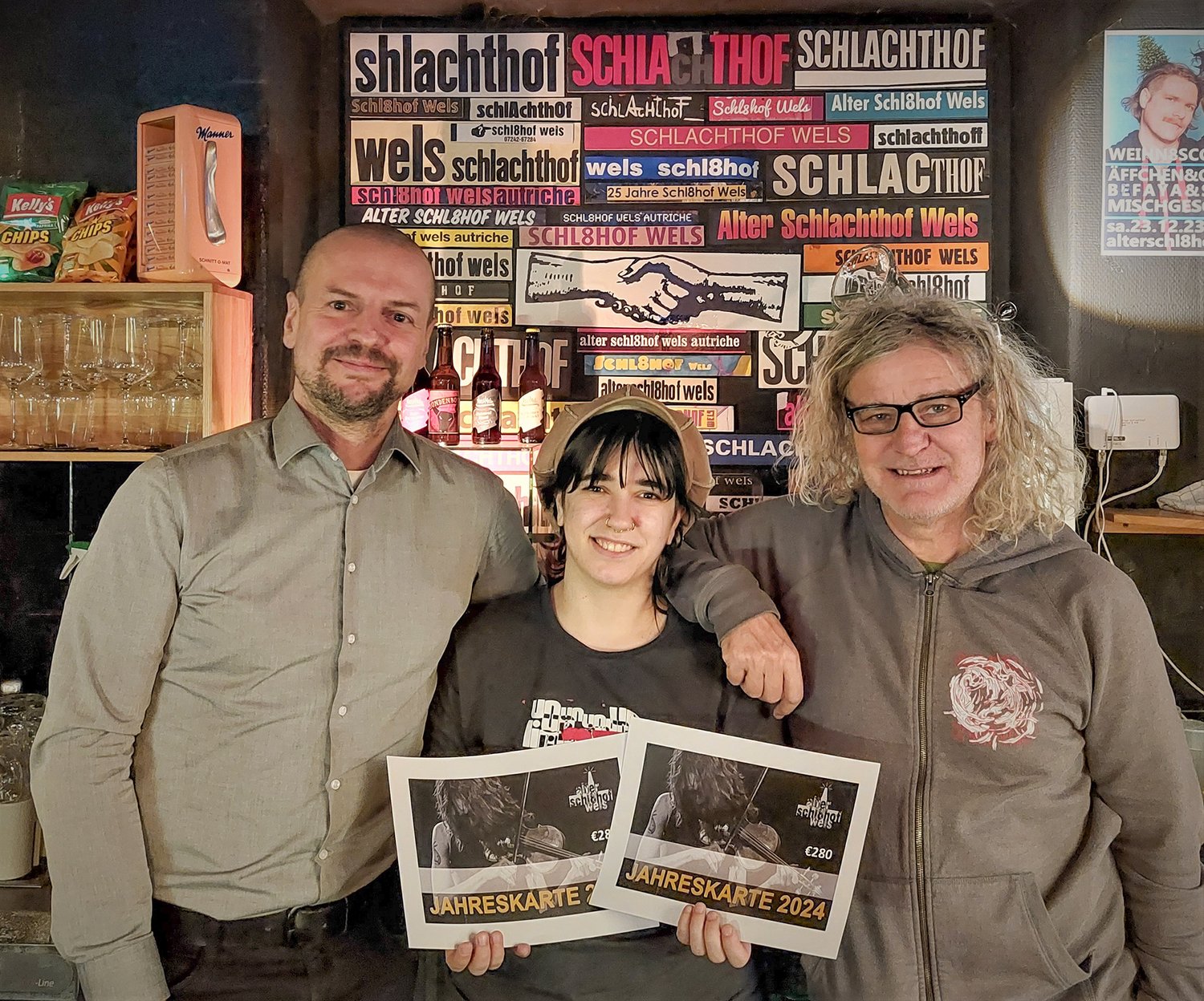 Nachtrag zu den Welser Weihnachtsgeschenken: Wer hier noch keine Idee hat, ist beispielsweise beim Kulturzentrum Alter Schlachthof (DragonerstraĂe 22) richtig. Neben Einzeltickets des entstehenden Programmes 2024 â Details immer aktuell unter schlachthofwels.at/programm â ist auch bereits die Jahreskarte fĂŒr mehr als 120 Veranstaltungen um nur 280 Euro erhĂ€ltlich. FĂŒr diese rĂŒhren Schlachthof-Referent Stadtrat Thomas Rammerstorfer, Corinne Leonhardsberger und Wolfgang Wasserbauer (im Bild v.l.) die Werbetrommel. Weitere Infos unter schlachthofwels.at im Internet!