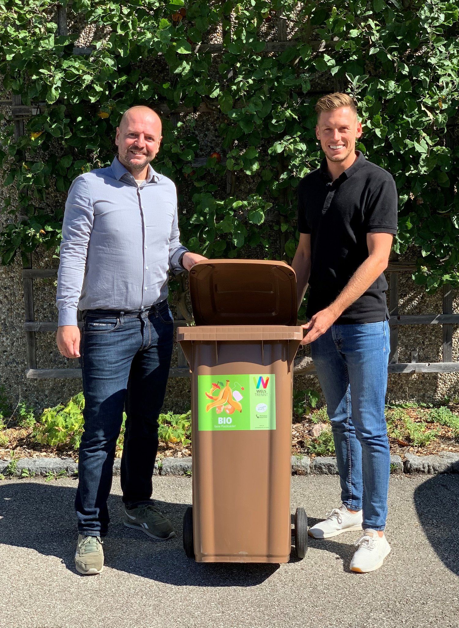 Stadtrat Thomas Rammerstorfer und der stĂ€dtische Abfallbeauftragte Lukas AitzetmĂŒller machen Werbung fĂŒr das noch bis Freitag, 6. Oktober laufende Biotonnen-Gewinnspiel der Umweltprofis.