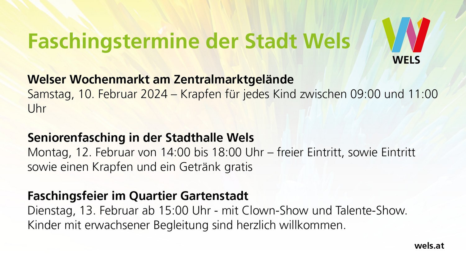 Am Wochenmarkt (Dr.-Salzmann-Straße – Dragonerstraße – Hamerlingstraße) gibt es am Samstag, 10. Februar von 09:00 bis 11:00 Uhr für jedes Kind einen Krapfen vom Demlgut (Familie Grabmair), solange der Vorrat reicht. Um einen bunten Marktvormittag zu garantieren, ist bei den Kleinen Verkleidung erwünscht. Geöffnet ist von 06:00 bis 13:00 Uhr, weitere Infos unter wels.at/markt im Internet.