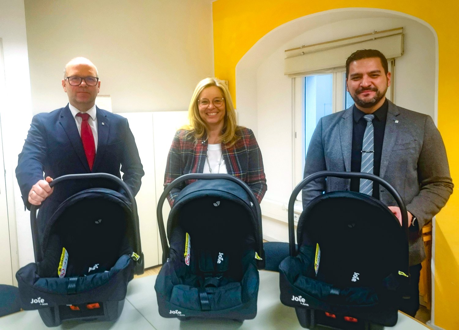 Über eine Spende von zwölf Babyschalen aus einem Restbestand von XXXLutz freut sich die Dienststelle Kinder- und Jugendhilfe (KJH). Die Vertreter der international tätigen Möbelhauskette mit Sitz in Wels möchten auf diese Weise Familien unterstützen, die sich eine derartige Anschaffung (Normalpreis im Handel rund 100 Euro) nicht oder nur sehr schwer leisten könnten. Im Bild Sozialreferentin Vizebürgermeisterin Christa Raggl-Mühlberger mit dem interimistischen Leiter der KJH Turgay Yilmaz, MA und dem Leiter der Abteilung Soziales, Mag. Martin Pantlitschko.