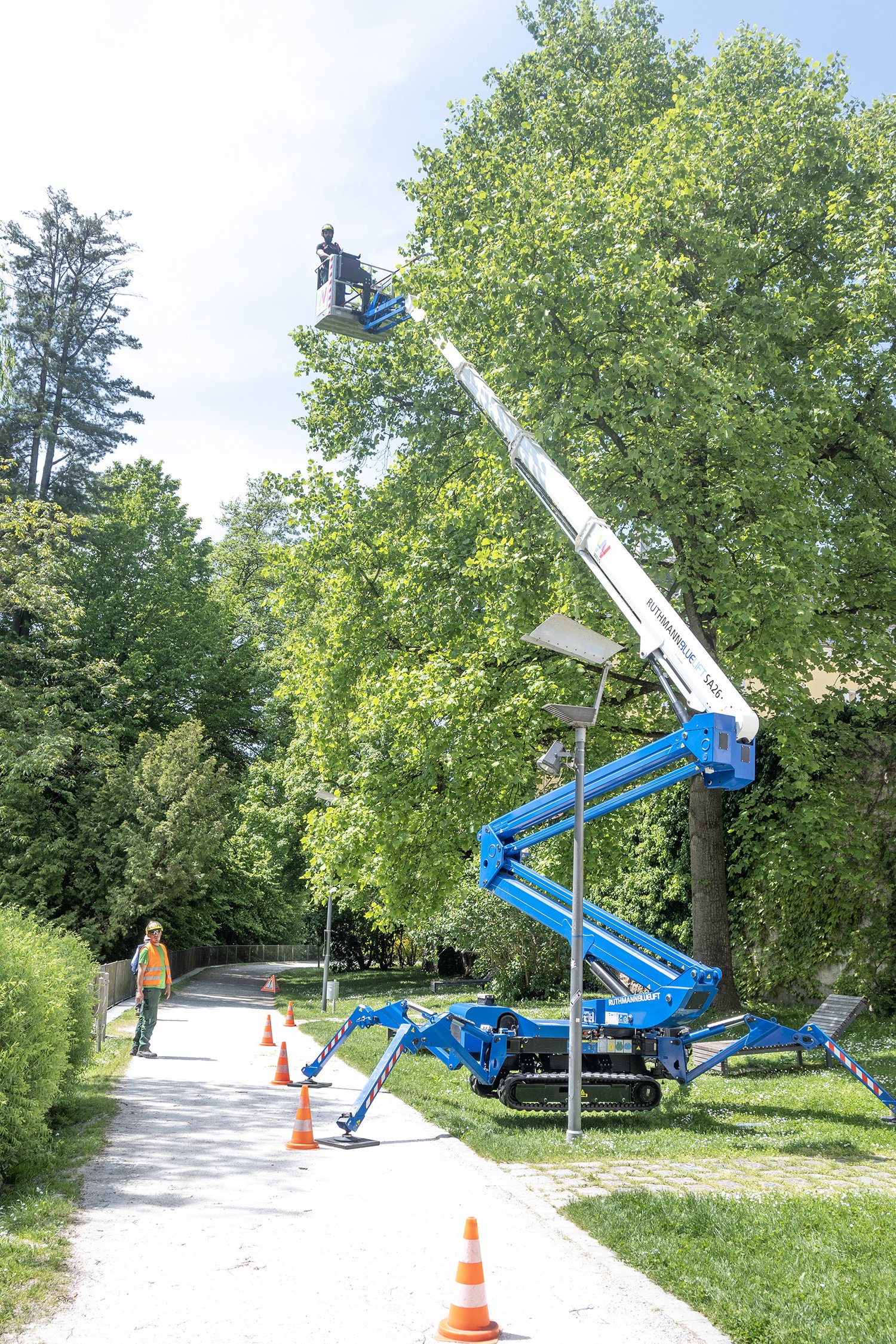 Eine neue Arbeitsbühne (vulgo „Hubsteiger“) hat ab sofort die Dienststelle Stadtgärtnerei zur Verfügung. Der Ruthmann Bluelift SA26 mit Raupenantrieb wird mit seiner Arbeitshöhe von 26 Metern und seiner maximalen Reichweite von 14,5 Metern vor allem die Baumkontrolle und -pflege erleichtern. Das Gerät verfügt über automatische Zentrierung, Abstützautomatik, verstellbare Laufbahnbreite, asymmetrische Abstützung für Arbeiten nahe an Häusern und Einfahrautomatik, einen Alu-Transportanhänger und natürlich über die neueste Technologie an Sicherheitseinrichtungen. Vizebürgermeister Gerhard Kroiß und Vizebürgermeisterin Christa Raggl-Mühlberger begutachteten als zuständige Referenten für die Stadtgärtnerei das neue Gerät Am Zwinger.