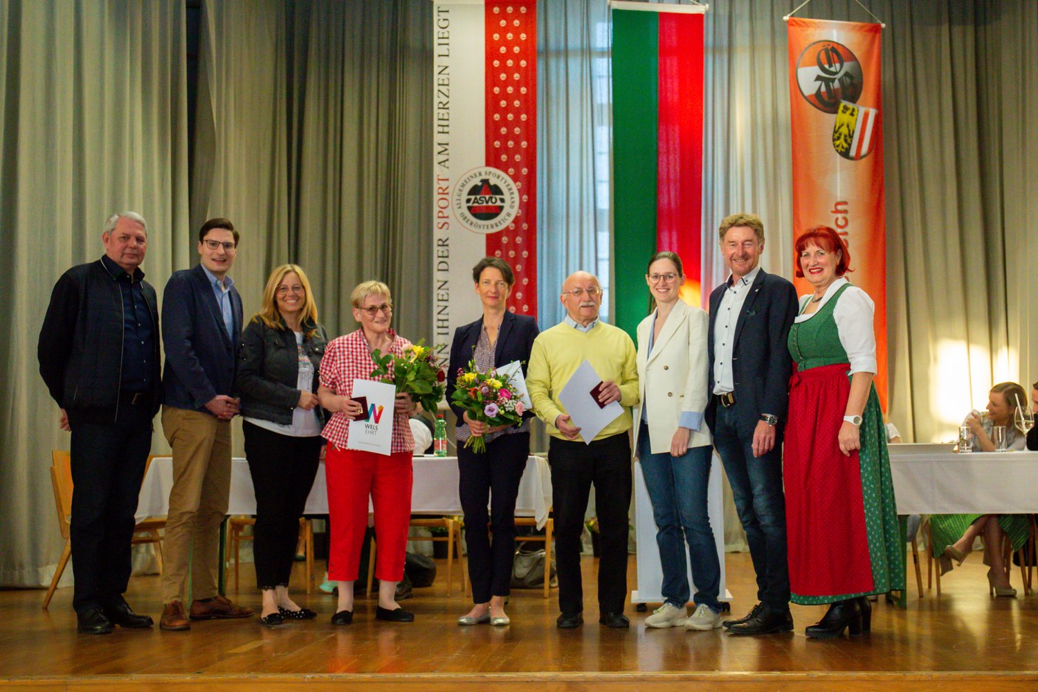 Sportehrenzeichen der Stadt Wels erhielten kürzlich mehrere verdiente Funktionäre des Welser Turnvereins 1862. Im Bild v.l. Konsulent Helmut Aichbauer (ASVOÖ Bezirksvorstand Wels), Stadtrat Stefan Ganzert, Vizebürgermeisterin Christa Raggl-Mühlberger, Susie Wilzek-Humer (Gold), Gabriele Hackl (Silber), Gerhard Felbermayr (Gold), Gemeinderätin Christiane Kroiß, Sportreferent Vizebürgermeister Gerhard Kroiß und Eva Schick (Obfrau WTV 1862).