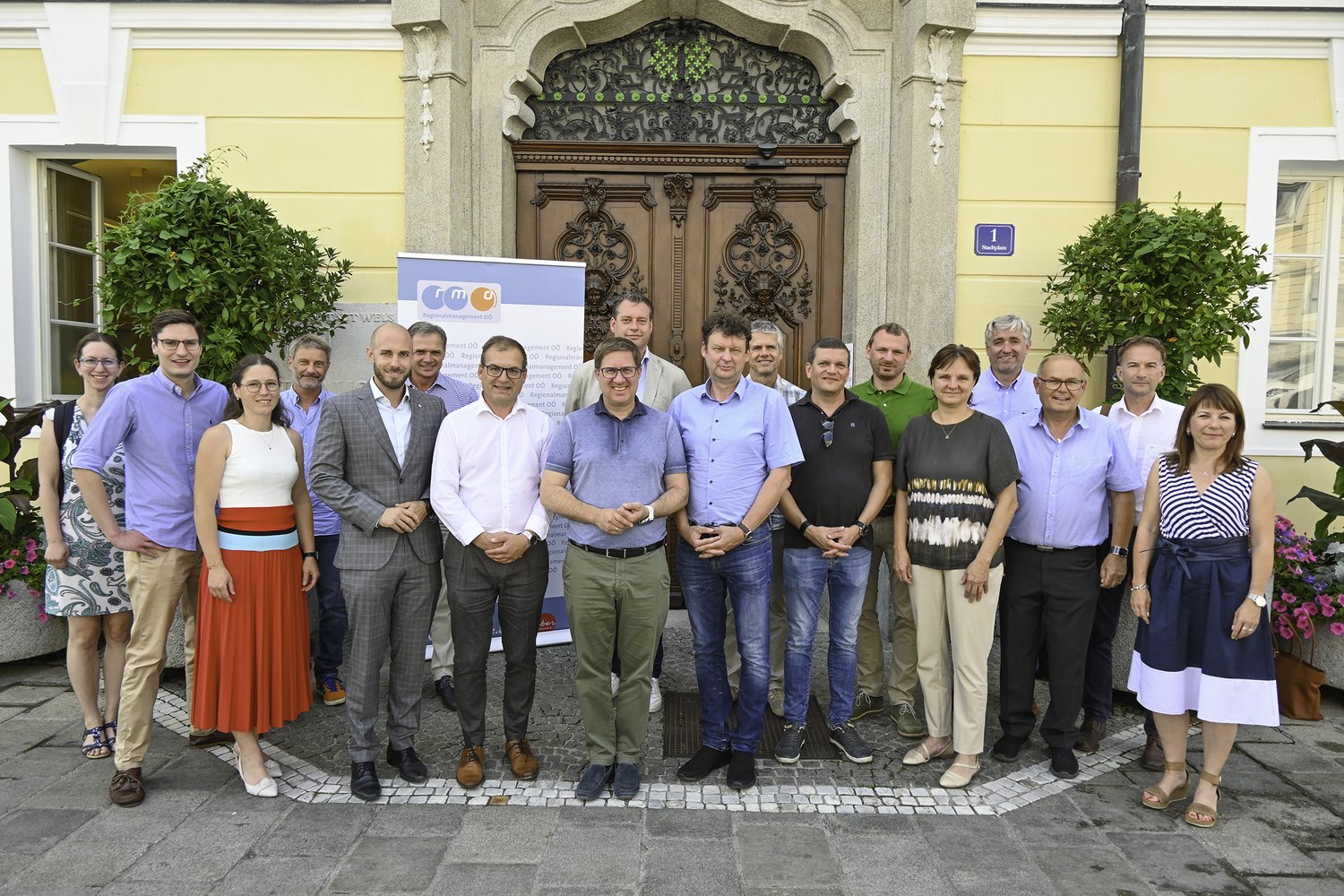Nahmen von politischer Seite für die Stadt Wels an der Veranstaltung der Stadtregion Wels teil: Bürgermeister Dr. Andreas Rabl (8.v.l.) sowie die Stadträte Ralph Schäfer (5.v.l.) und Stefan Ganzert (2.v.l.).