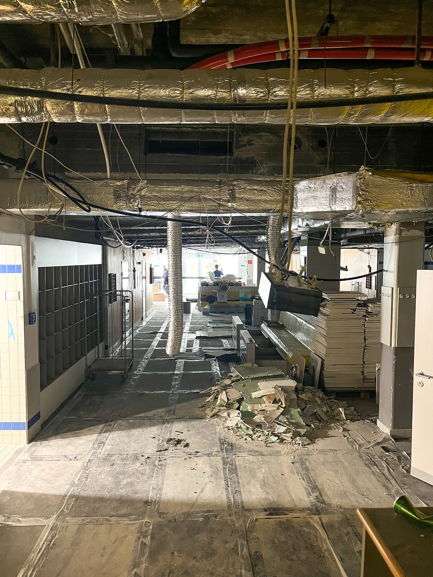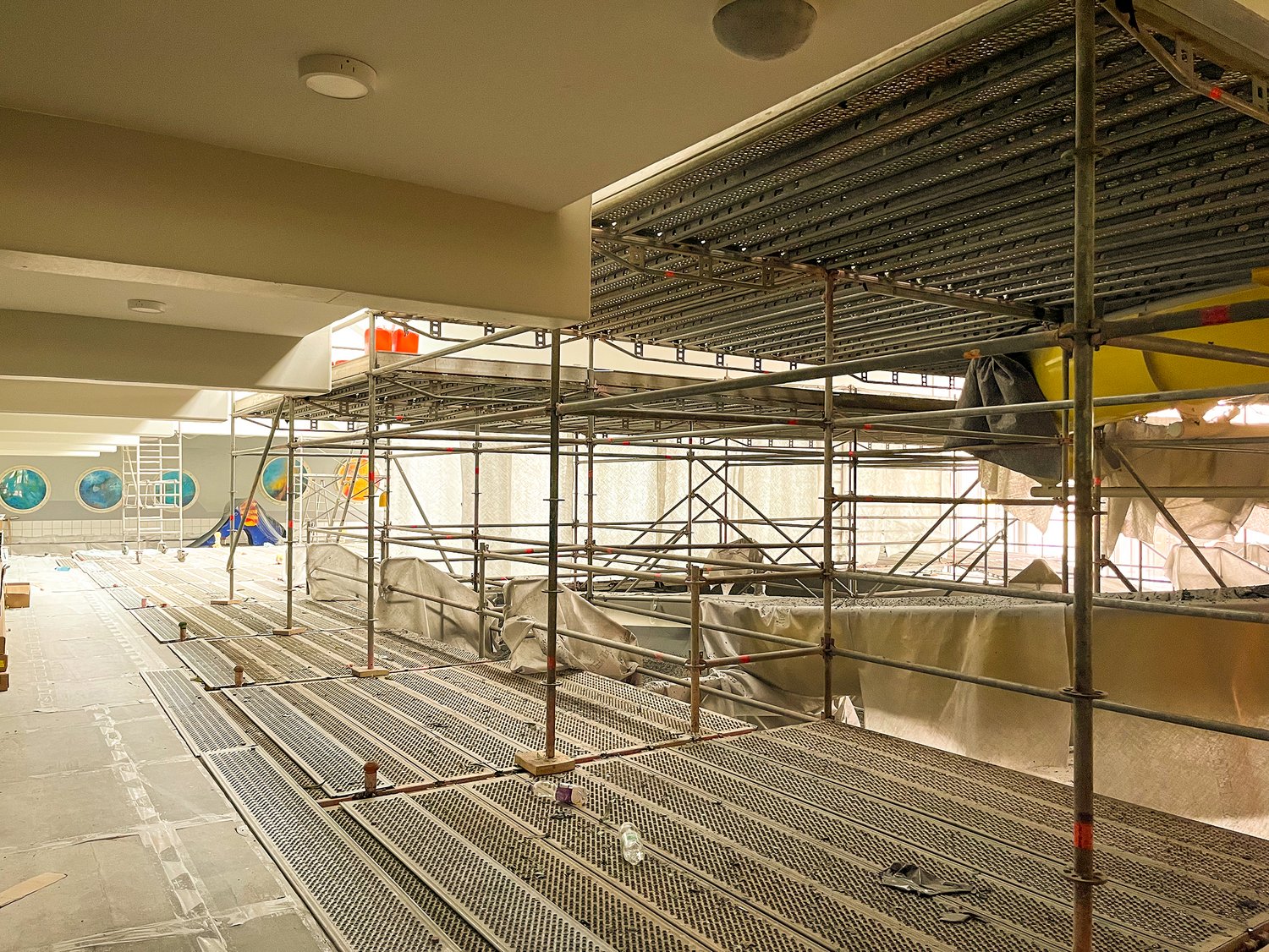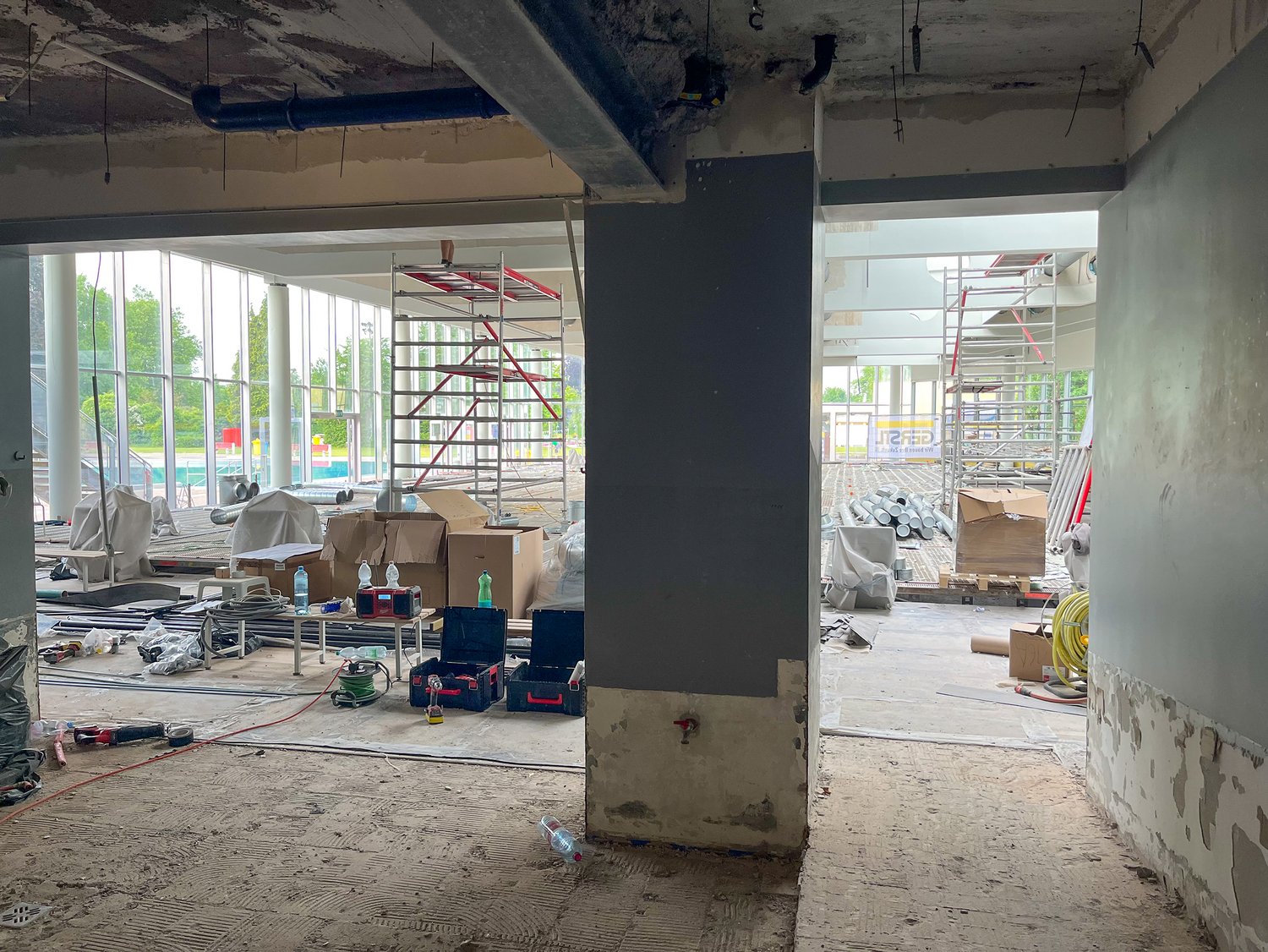 Derzeit wird im Innenbereich unter anderem an der neuen Bädertechnik, der Dachsanierung sowie an der Installations- und Elektrotechnik gearbeitet. Der Sanitärbereich im Sportbecken wurde bereits zur Gänze entkernt und auch die alten Sauna-Kammern bereits demontiert. Die nächsten Arbeiten sind der Aufbau der neuen Sauna-Kammern, Fliesenleger- und Malerarbeiten sowie die Montage der neuen Decke im Lehrschwimmbecken.
