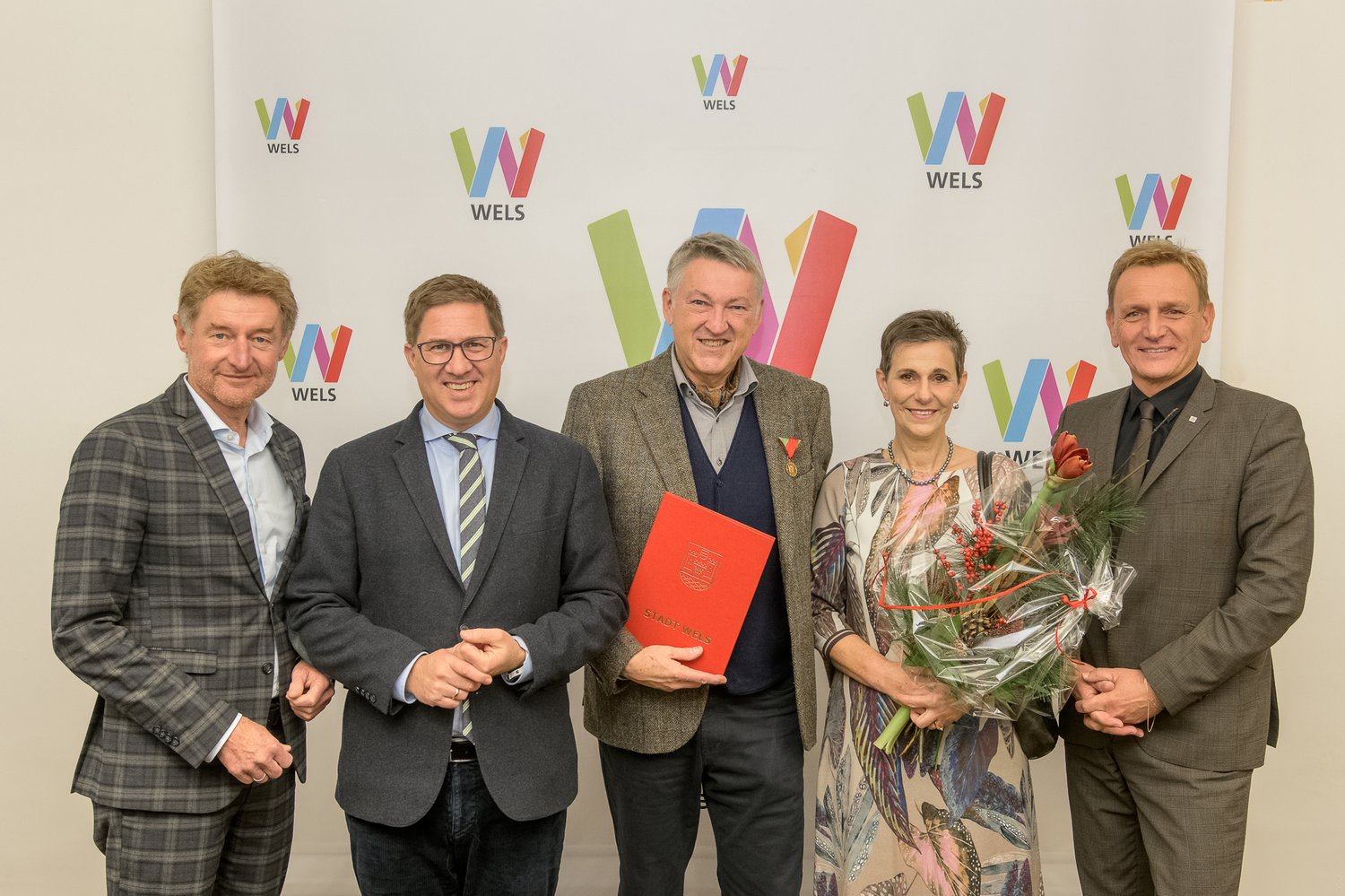 Ăber die HumanitĂ€ts-Verdienstmedaille der Stadt Wels in Gold darf sich Dr. Wolfgang Raus freuen. Der Allgemeinmediziner mit Zusatzausbildungen in Akupunktur und Manueller Medizin ordiniert seit 1990 in seiner Praxis in der Vogelweide. ZusĂ€tzlich um das Welser Gesundheitswesen verdient machte sich Dr. Raus von 2012 bis 2022 als BezirksĂ€rztevertreter sowie Anfang der 1990er Jahre als beratender Arzt im Kinderschutzzentrum Tandem und Ortsstellenleiter des Roten Kreuzes. Weiters ist er seit 2018 als Lektor am Kepler Uniklinikum Linz tĂ€tig. Die Verleihung erfolgte durch BĂŒrgermeister Dr. Andreas Rabl im Beisein der VizebĂŒrgermeister Gerhard KroiĂ und Mag. Klaus Schinninger.