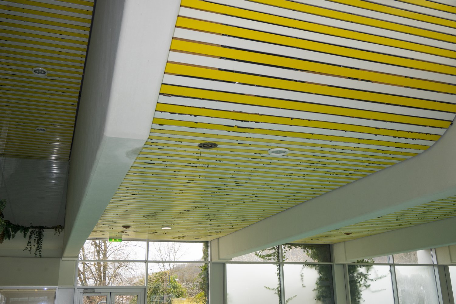 AbgehÀngte Decke im Schwimmbadbereich: Abbruch von rund 1.900 Quadratmetern abgehÀngter Holz-/Gipskarton-Decke aus den 1970er und 2000er Jahren, Neuerrichtung von rund 1.900 Quadratmetern Alupaneldecke mit erhöhten SchalldÀmmwerten (68.000 Laufmeter Alupaneele).