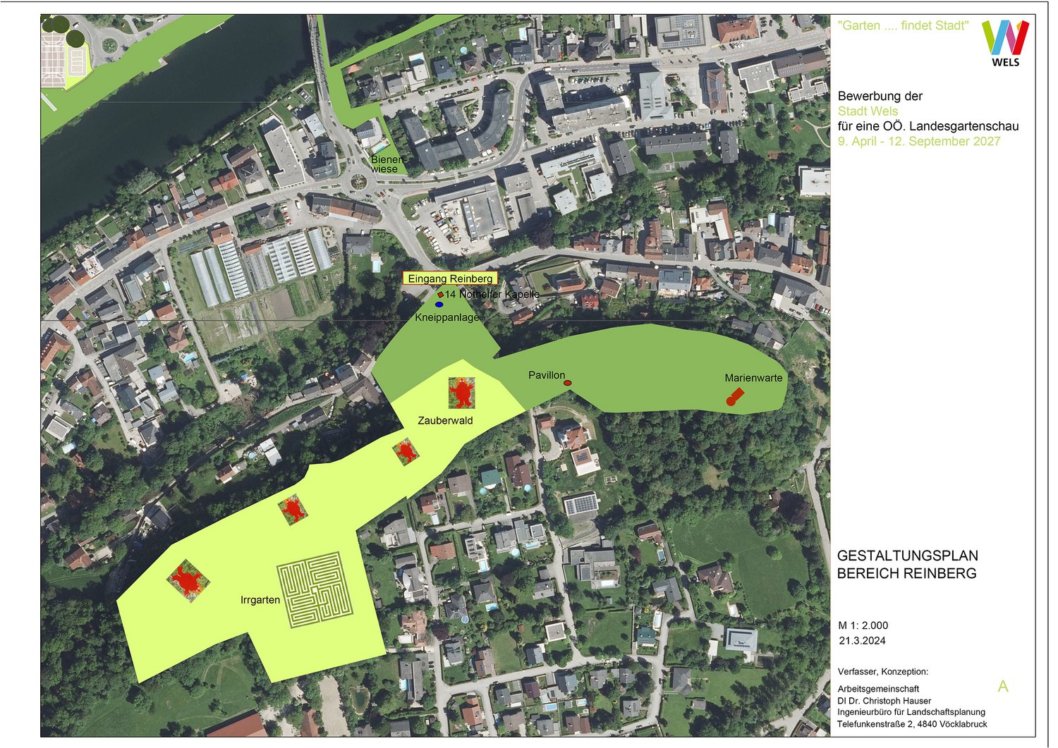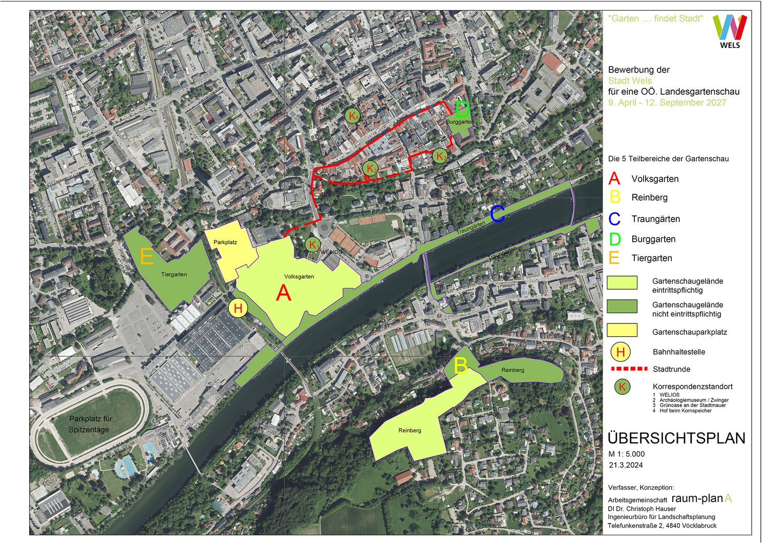 Für die Konzepterstellung konnte Wels Dipl.-Ing. Dr. Christoph Hauser von der Arbeitsgemeinschaft raum-planA (Vöcklabruck/Grieskirchen) gewinnen. Der Landschaftsökologe und -gestalter (Universität für Bodenkultur Wien) hat bereits drei OÖ. Landesgartenschauen als Geschäftsführer begleitet: Vöcklabruck 2007, Ansfelden 2011 und Bad Ischl 2015. Diese Erfahrungen flossen in das mit Dipl.-Ing. Christoph Haslmayr (Leiter Dienststelle Stadtgärtnerei) entworfene Konzept „Garten…findet Stadt“ für die von Freitag, 9. April bis Sonntag, 12. September 2027 geplante OÖ. Landesgartenschau ein. Für diese ist Wels gleich aus mehreren Gründen als Austragungsort bestens geeignet: