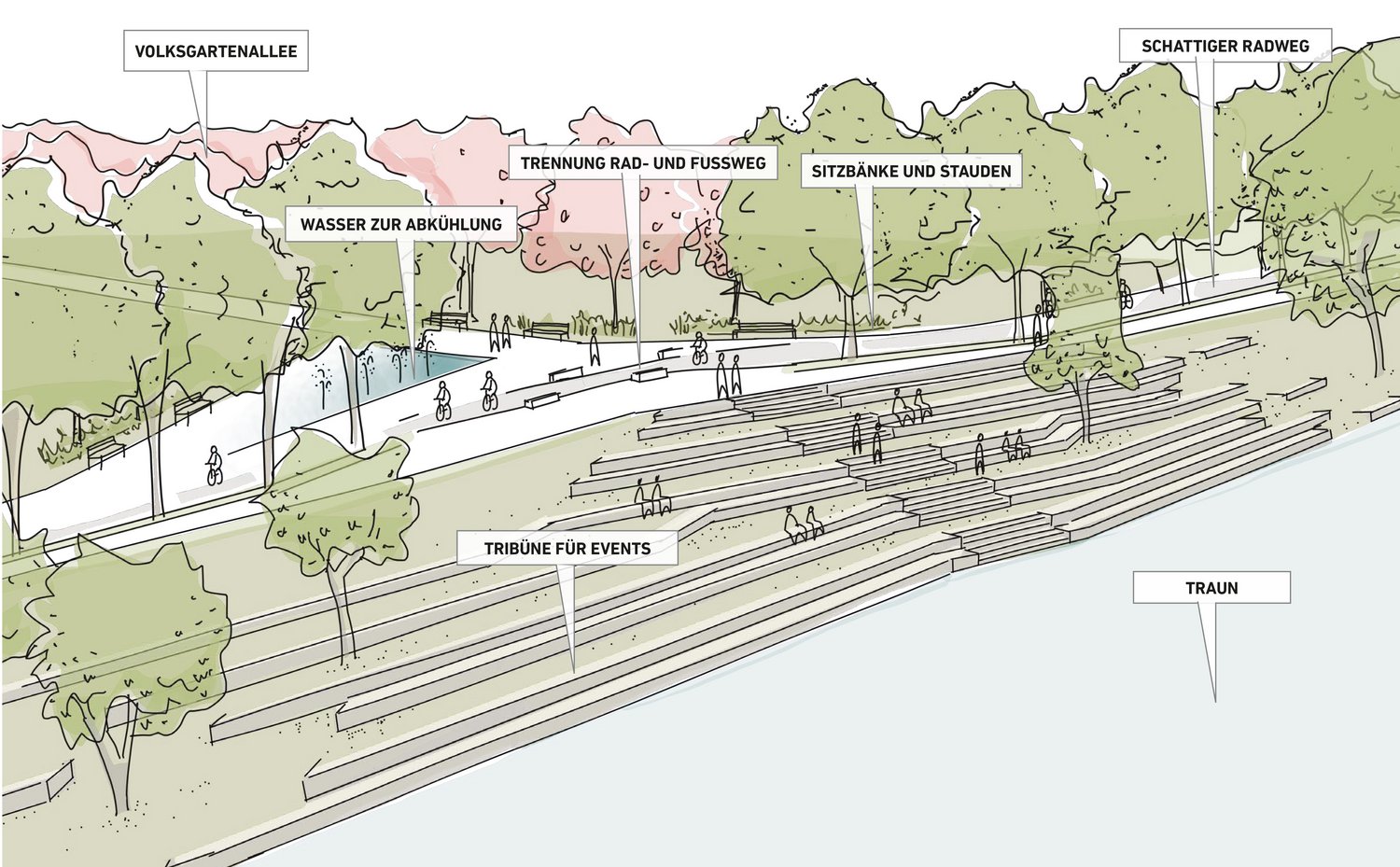 Im neuen Volksgarten sind laut Planung drei gut ersichtliche Zonen vorgesehen. Die erste bildet entlang des Traunufers einen Bewegungsraum fĂŒr Sportler und SpaziergĂ€nger. Die bereits bestehende Promenade wird dabei integriert und dadurch aufgewertet. Eine Verbreiterung soll die Konfliktsituation zwischen den unterschiedlichen Geschwindigkeiten von Radfahrern, Joggern und Flanierern entschĂ€rfen. Eine Trennung von Rad- und FuĂweg wird nicht nur durch Bodenmarkierungen, sondern auch durch GrĂŒnstreifen und unterschiedliche Materialien erfolgen.
