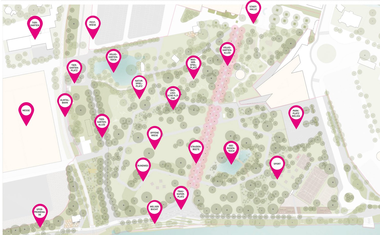 Den Planungsarbeiten vorausgegangen war ein BĂŒrgerbeteiligungsprozess im Jahr 2022. Dessen Anregungen wurden â so weit möglich und realisierbar â in den nun vorliegenden Vorentwurf eingearbeitet. Dieser sieht vor, nach dem Abriss der alten Messehallen den bestehenden Volksgarten bis zum Traunufer zu erweitern. Als rund 10 Hektar groĂer âPark fĂŒr alleâ mit zahlreichen Nutzungsmöglichkeiten soll der Volksgarten seine historische Bedeutung wieder erhalten. Es entsteht ein Ort mit hoher AufenthaltsqualitĂ€t und zahlreichen Spiel- und Sportangeboten bei gleichzeitiger Integration von Natur und Ăkologie. Nachstehend die Eckpunkte des Konzeptes (welches im Falle des von der Stadt Wels erhofften Zuschlages fĂŒr die Landesgartenschau 2027 noch adaptiert wird):