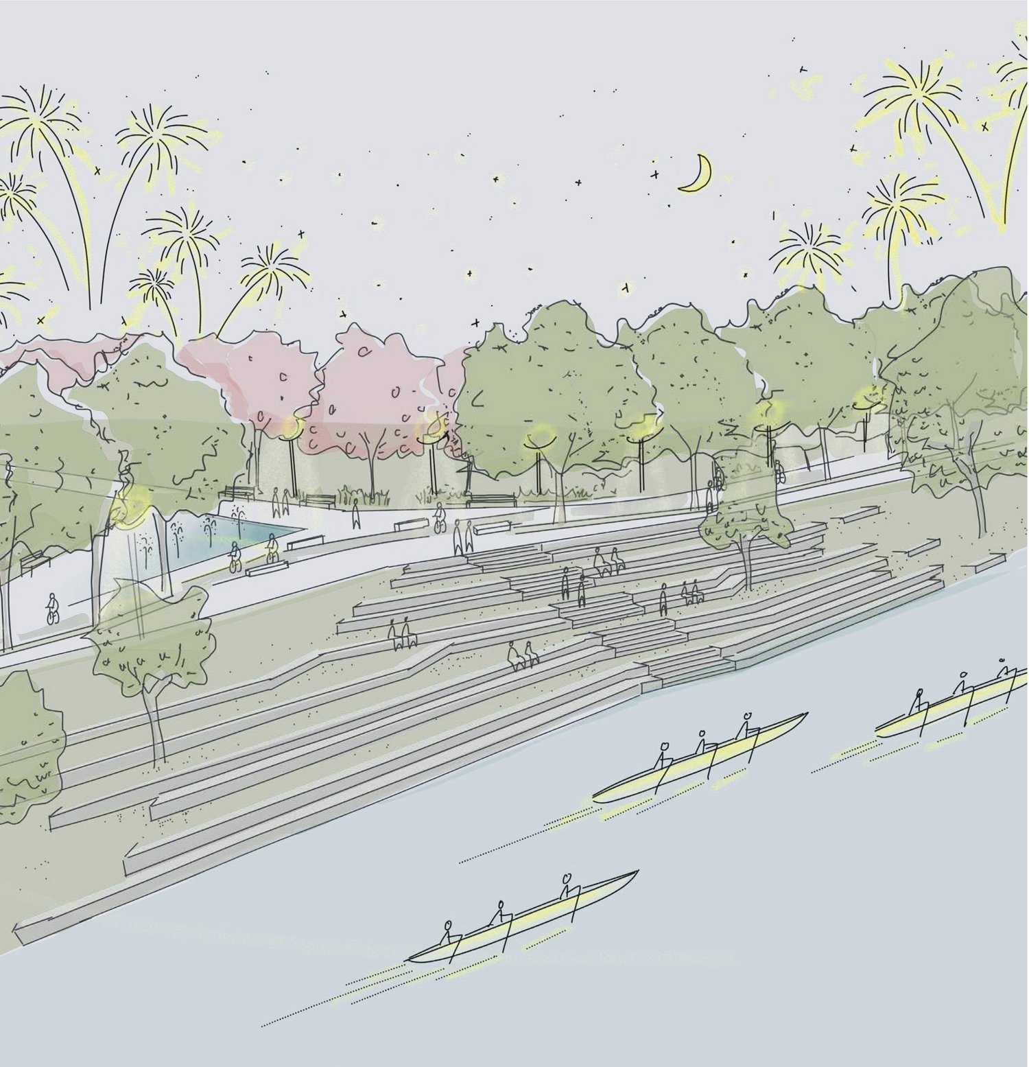 Diese wichtige Barriere-Funktion wird unter anderem auch eine Reihe von SitzbĂ€nken erfĂŒllen, die entlang der Promenade zum Verweilen einladen. Eine weitere Verbesserung der AufenthaltsqualitĂ€t direkt am Ufer bietet die Welser Bucht: Diese wird die 2009 errichtete âSummer Stageâ in erweiterter Form ersetzen und auf Sitzstufen einen freien Blick auf die Traun ermöglichen. Die terrassierte Landschaft bietet laut Planung auch Platz fĂŒr kleinere Veranstaltungen. Auch das in den heiĂen Sommern immer beliebter werdende Baden im Fluss bleibt von der Welser Bucht aus ebenso möglich wie vom stromaufwĂ€rts gelegenen Traunstrand, der in das neue Konzept integriert wird.