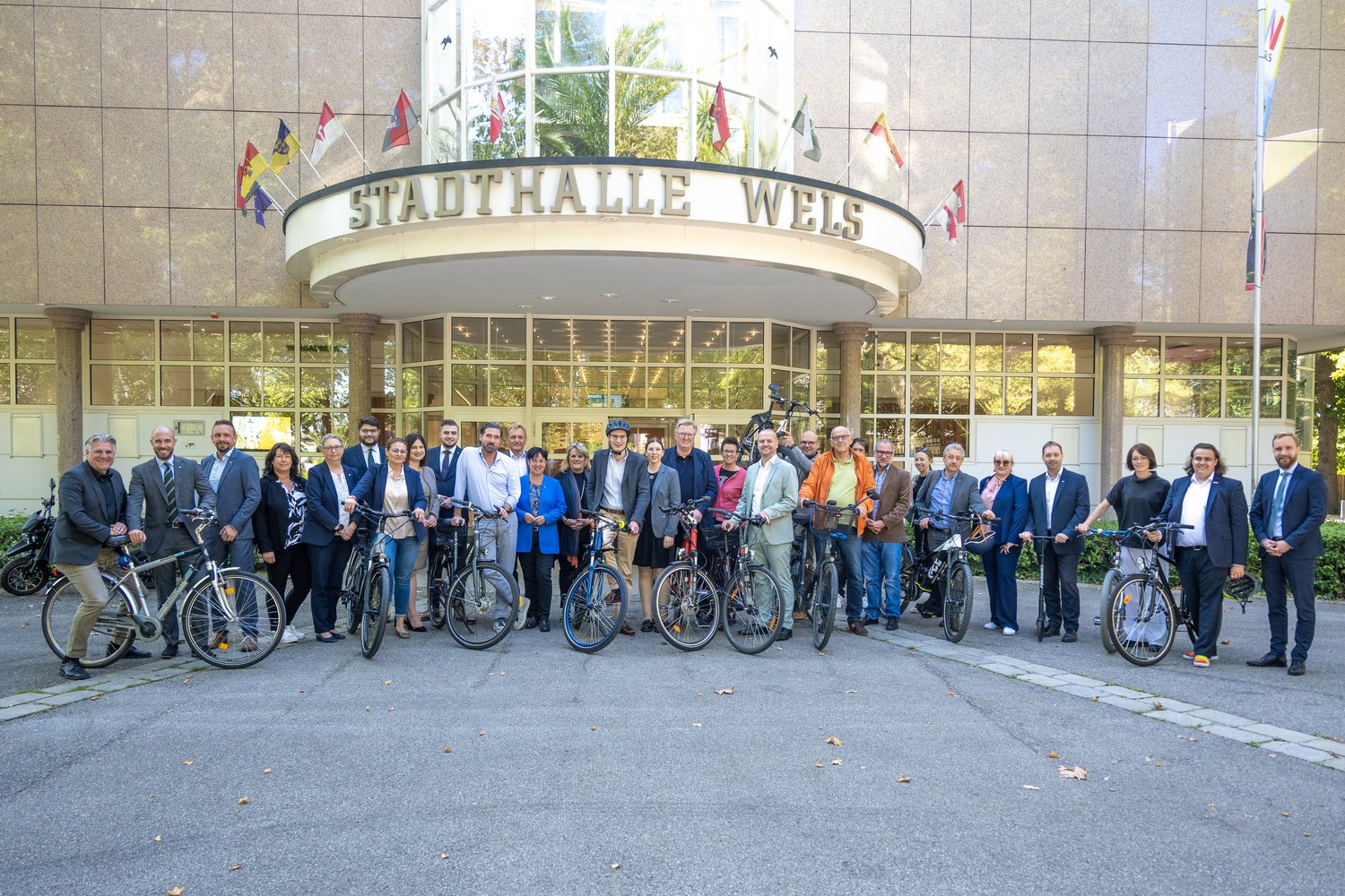 Gruppenfoto zur GEHmeindeRADsitzung im Volksgarten vor der Welser Stadthalle.