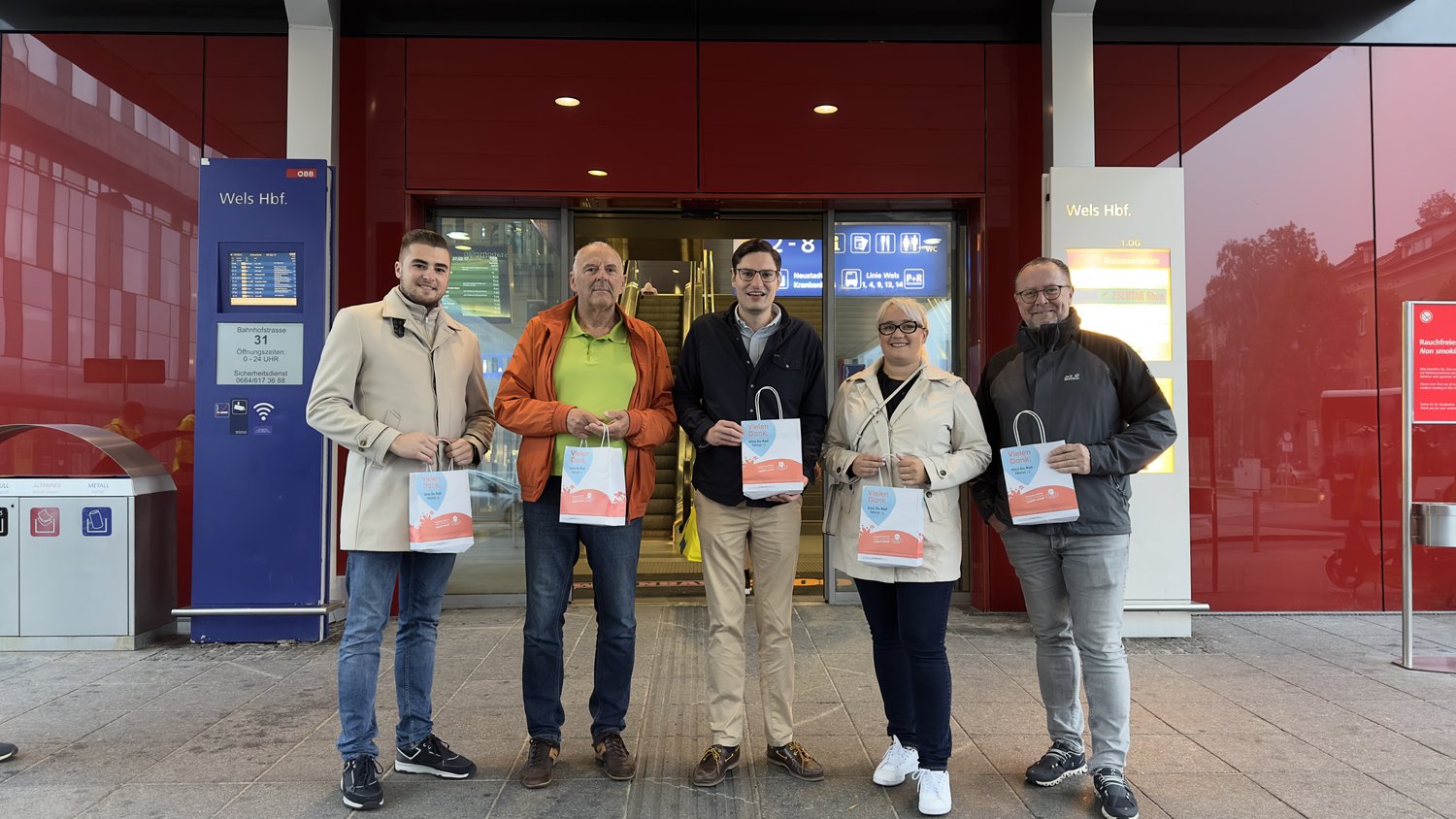 V.l. Gemeinderäte Fabian Bauer und Mag. Walter Teubl, Mobilitätsstadtrat Stefan Ganzert, Gemeinderätin Gloria-Maria Umlauf und Gemeinderat Andreas Weidinger beim Verteilen am Hauptbahnhof.