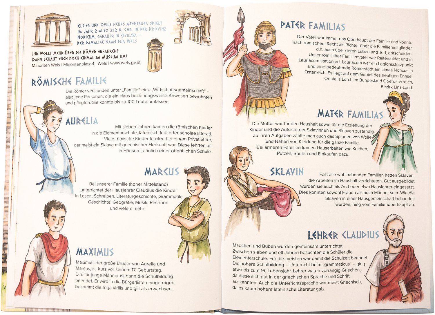 Aber Ende gut, alles gut! Denn das Buch endet dort, wo Jung und Alt zahlreiche FundstĂŒcke aus dem antiken Ovilava und noch mehr Infos ĂŒber das römische Wels finden: Im Stadtmuseum Minoriten (Minoritenplatz 4)! Dort warten bei rechtzeitiger Anmeldung per E-Mail unter m@wels.gv.at oder unter Tel. +43 7242 235 7350 folgende interessante museumspĂ€dagogische Programme sowie die Möglichkeit zum Feiern eines Kindergeburtstages: