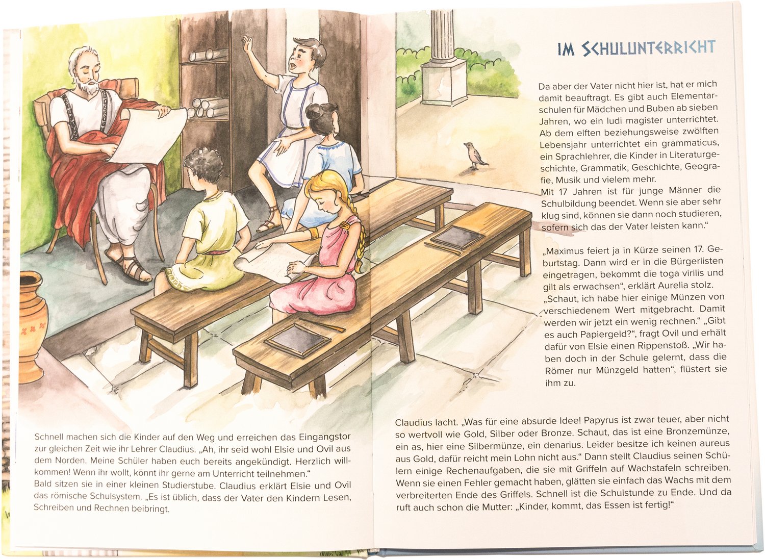 Elsie und Ovil tauchen tief in die römische Vergangenheit von Wels ein. WĂ€hrend eines Besuchs in der archĂ€ologischen Sammlung im Minoriten-Museum finden sich die beiden plötzlich im römischen Ovilava wieder. Dort bestaunen sie das antike Stadtbild, nehmen am Schulunterricht teil, fiebern bei einem Wagenrennen mit und genieĂen römische Speisen und GetrĂ€nke. Hier drei Leseproben: